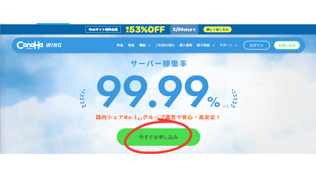 まずはConoHa WINGの公式サイトから「お申し込み」画面へ進みます。